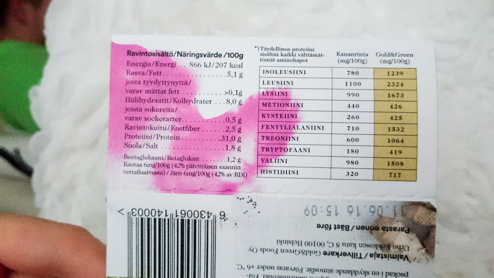 Nyhtökaurapakkauksessa on tavallisen ravintosisältöluettelon lisäksi avattu myös tuotteen aminohappokoostumusta, joka on kyllä ihailtavaa luettavaa :) Loistavaa suomalaista työtä!