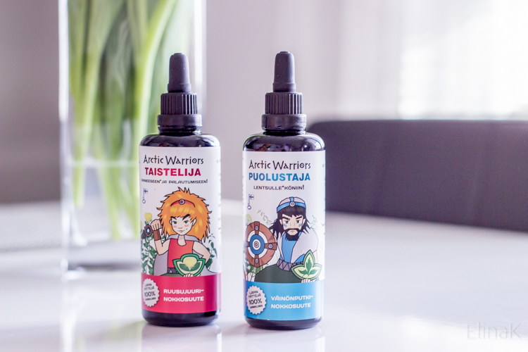 Sain Arctic Warriorsilta testattavakseni flunssan hoitoon ja ehkäisyyn tarkoitettua Puolustaja-uutetta, sekä stressin lievitykseen tarkoitettua Taistelija-uutetta. Puolustajan vaikuttavana aineena on väinönputki ja nokkonen, joista ensimmäisen pitäisi potkia jopa streptokokkia vastaan. Taistelijankin sisältä löytyy nokkosta, sekä lisäksi ruusunjuurta.